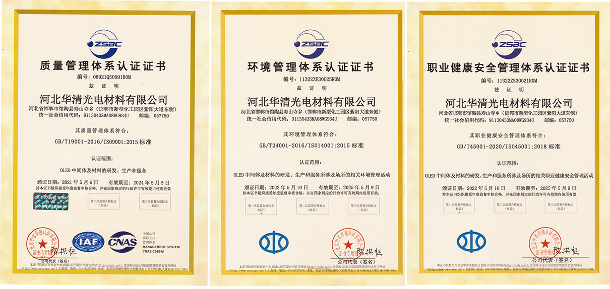 華清光電設(shè)有專門的品控部,貫徹以預(yù)防為主的風(fēng)險(xiǎn)管理理念,從原料到成品入庫(kù),做好每一步檢測(cè)評(píng)估,并配備有先進(jìn)的HPLC、GC、LCMAS、DSC、TGA、ICP-MAS等各類分析儀器,通過(guò)ISO9001、ISO14001和ISO45001體系認(rèn)證。